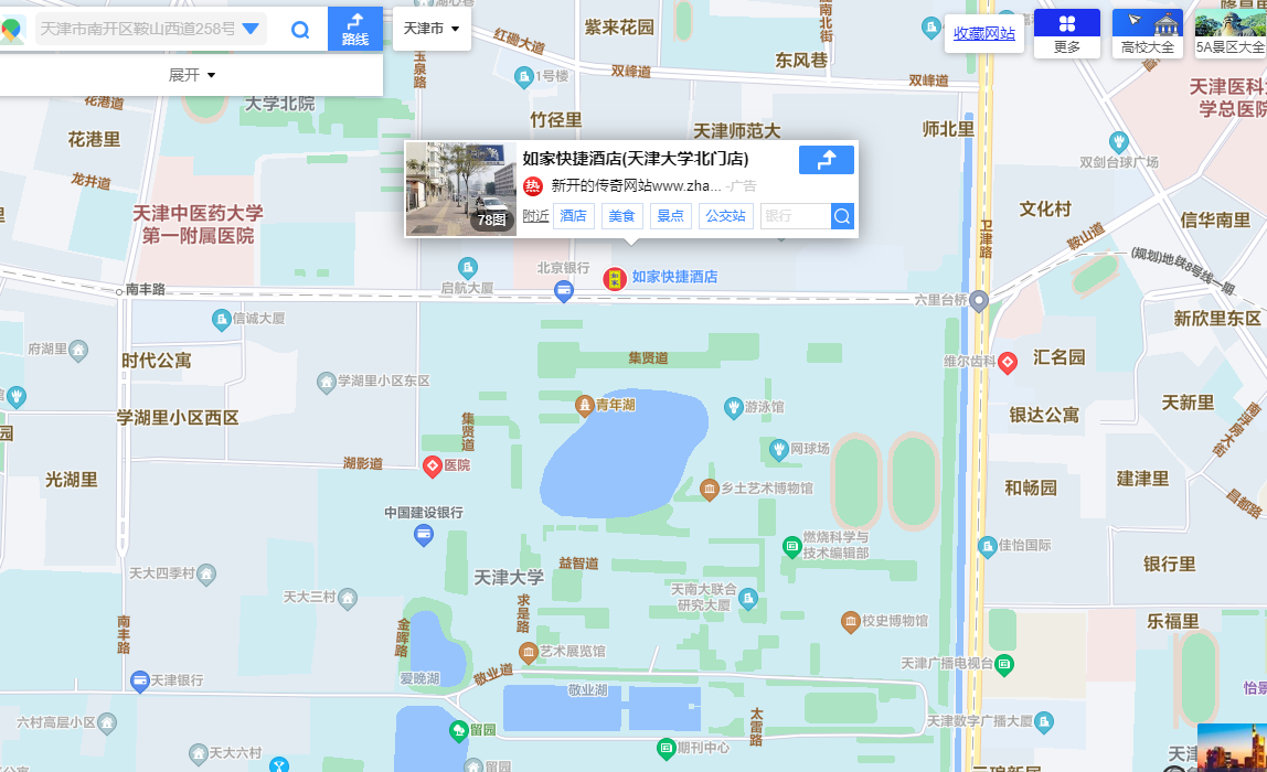 位于天津市南开区鞍山西道258号房地产,曾为如家快捷酒店(天津大学北门店),现为空置状态,无租赁。周边大学众多,位置在天津大学对面,交通极为便利。临街,独栋,独院,地理位置好。共6层,保持如家快捷酒店原貌装修,一部电梯,2个步梯。格局:一层有接待前台,一个酒店餐厅,外侧临街有5个门市店铺。2层至6层,每层约有25个房间,一个储物间。6层上有天台、信号塔、电梯机房。进门前院约有10个停车位,一个变电室、一个门卫岗亭,后院约有10个停车位。非常适合酒店经营,多家酒店及客户欲租用。