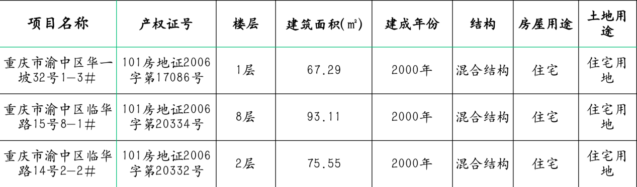 房屋坐落于重庆市渝中区华一坡32号1-3、临华路15号8-1、临华路14号2-2。华一坡32号1-3建筑面积为67.29平方米,所在层数1层。临华路15号8-1建筑面积为93.11平方米,所在层数8层。临华路14号2-2建筑面积为75.55平方米,所在层数2层。房屋用途均为住宅,房屋建成均为2000年,房屋结构均为混合结构。